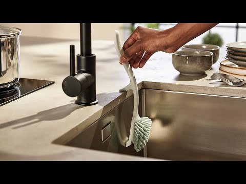 Este inteligente cepillo para lavavajillas está diseñado para descansar de forma segura en el costado del fregadero, permitiendo que toda la espuma de jabón se escurra fácilmente.