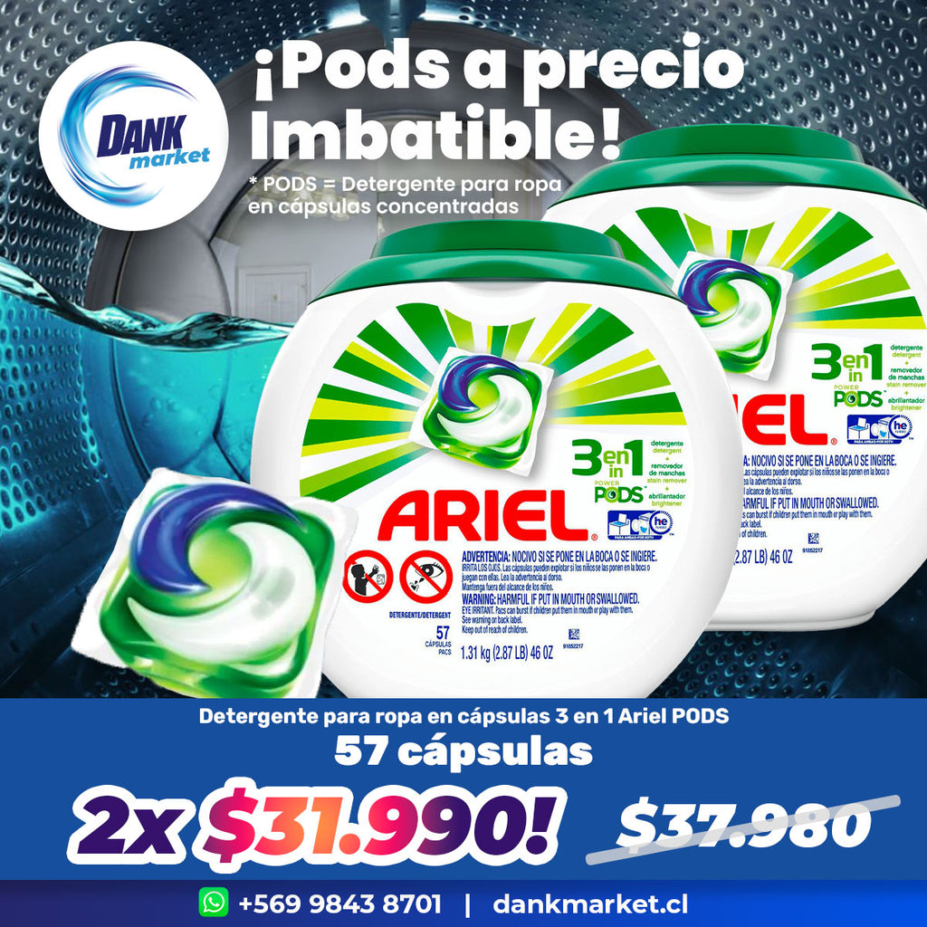 Oferta: Detergente para ropa en cápsulas 3 en 1 Ariel PODS 57 cápsulas. 2x $31.990