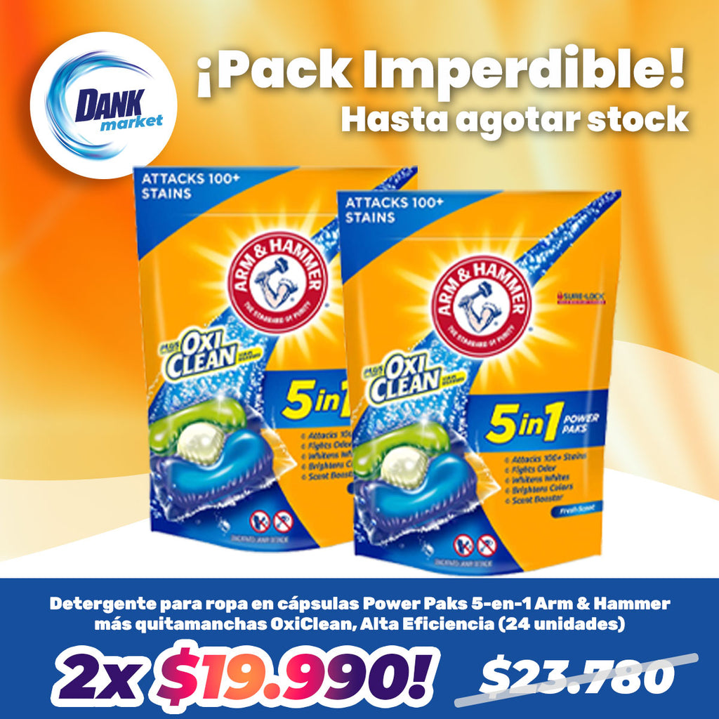 Oferta: Detergente para ropa en cápsulas Power Paks 5-en-1 Arm & Hammer más quitamanchas OxiClean, Alta Eficiencia (24 unidades) 2x $19.990