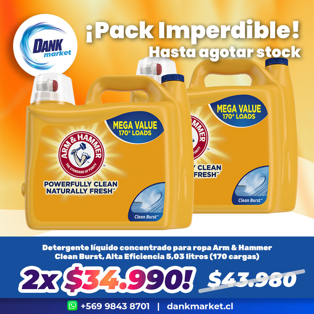 Oferta: Detergente líquido concentrado para ropa Arm & Hammer Clean Burst, Alta Eficiencia 5,03 litros (170 cargas) 2x $34.990