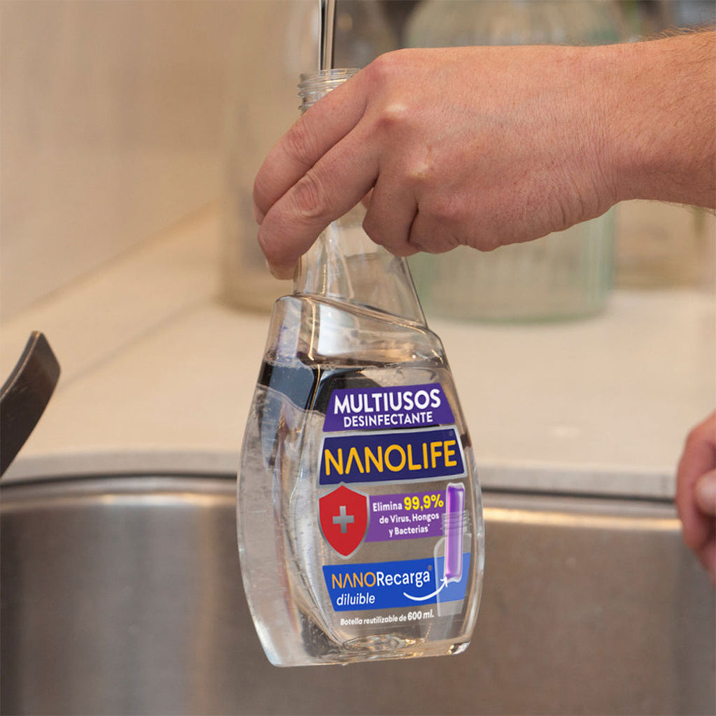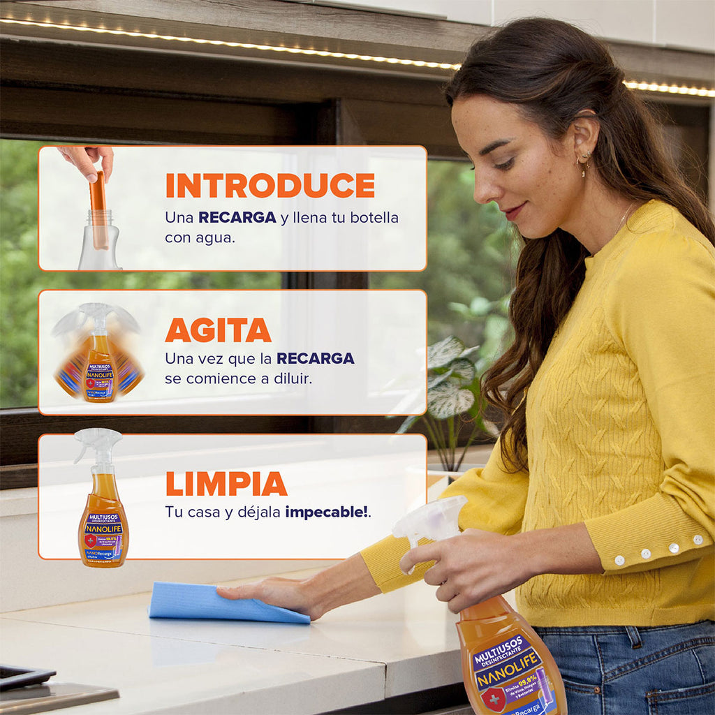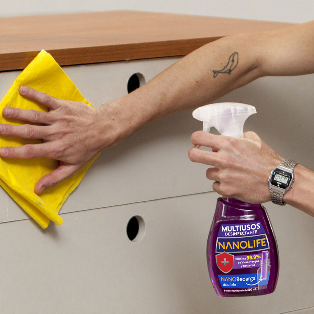 Con el Multiusos Desinfectante Nanolife®, cada spray limpia, desinfecta y aromatiza tus superficies con eficiencia y elegancia.